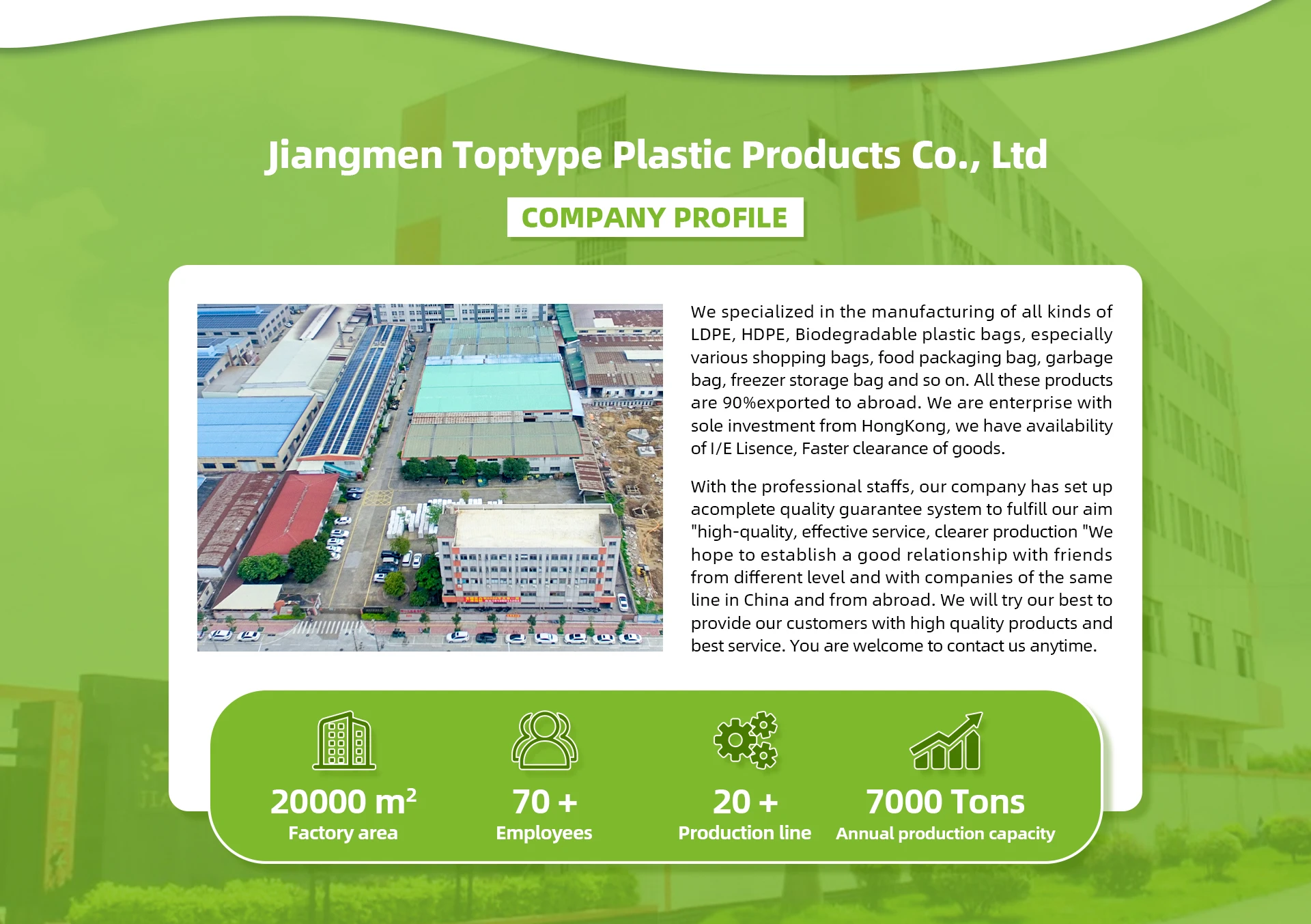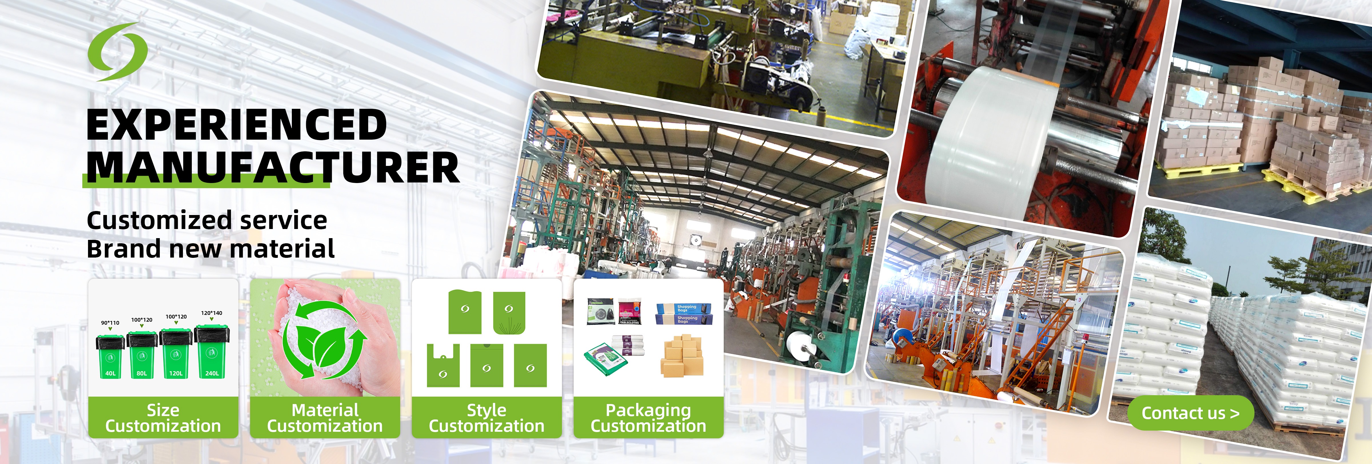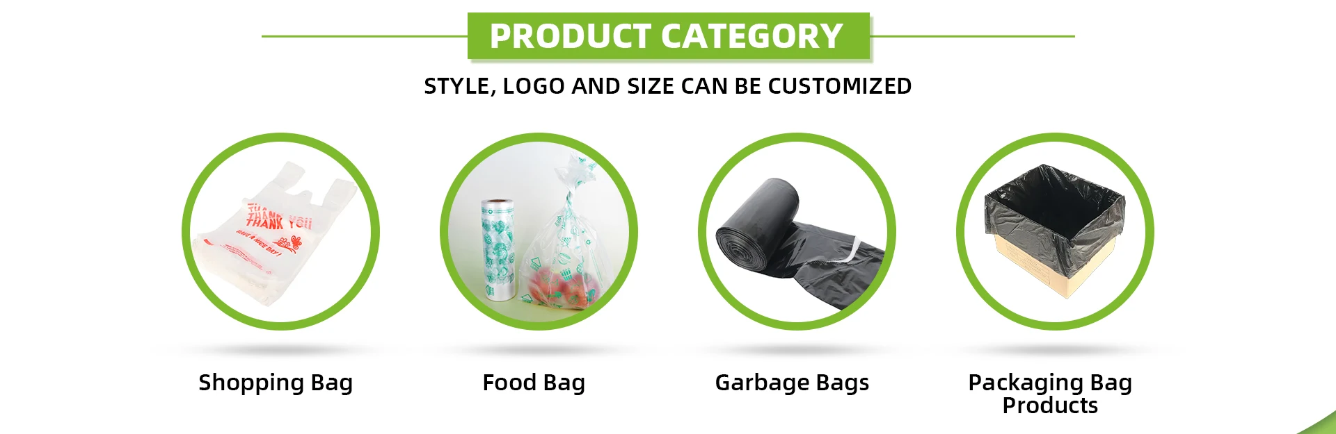 主な製品:プラスチック製のショッピングバッグ、プラスチック製のパッチハンドルショッピングバッグ、プラスチック製のダイカットハンドルショッピングバッグ、プラスチック製のTシャツショッピングバッグ、プラスチック製のflexiloopハンドルショッピングバッグ